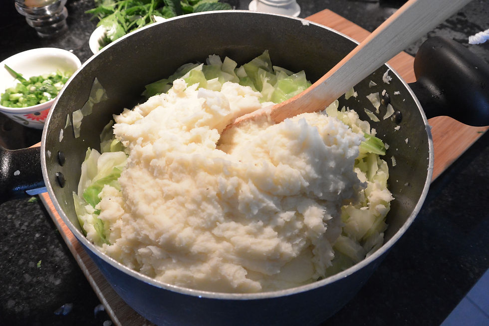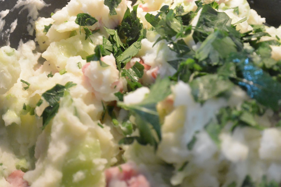Next add cabbage, scallions, parsley and ham to mashed potatoes, stirring them in gently.