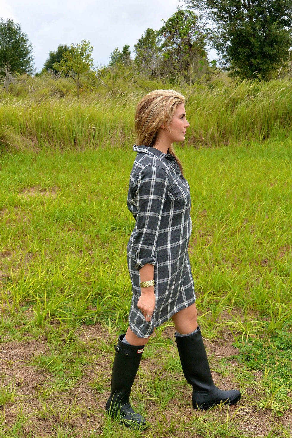Hurricane Matthew is coming and I have been preparing for days. I woke up, checked news about the storm, and got dressed. With the heavy rain in the forecast, I broke out my favorite Hunter boots, and paired them with a effortlessly simple gray plaid dress.