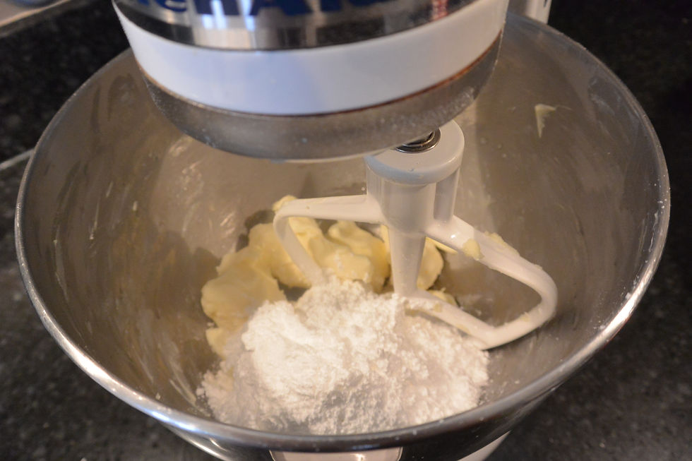 2. Beat in the butter one heaping 1/4 teaspoonful at a time, using an electric mixer set on low speed, until the mixture resembles coarse sand. Then beat in the sugar a tablespoon at a time, until the mixture resembles fine damp sand.